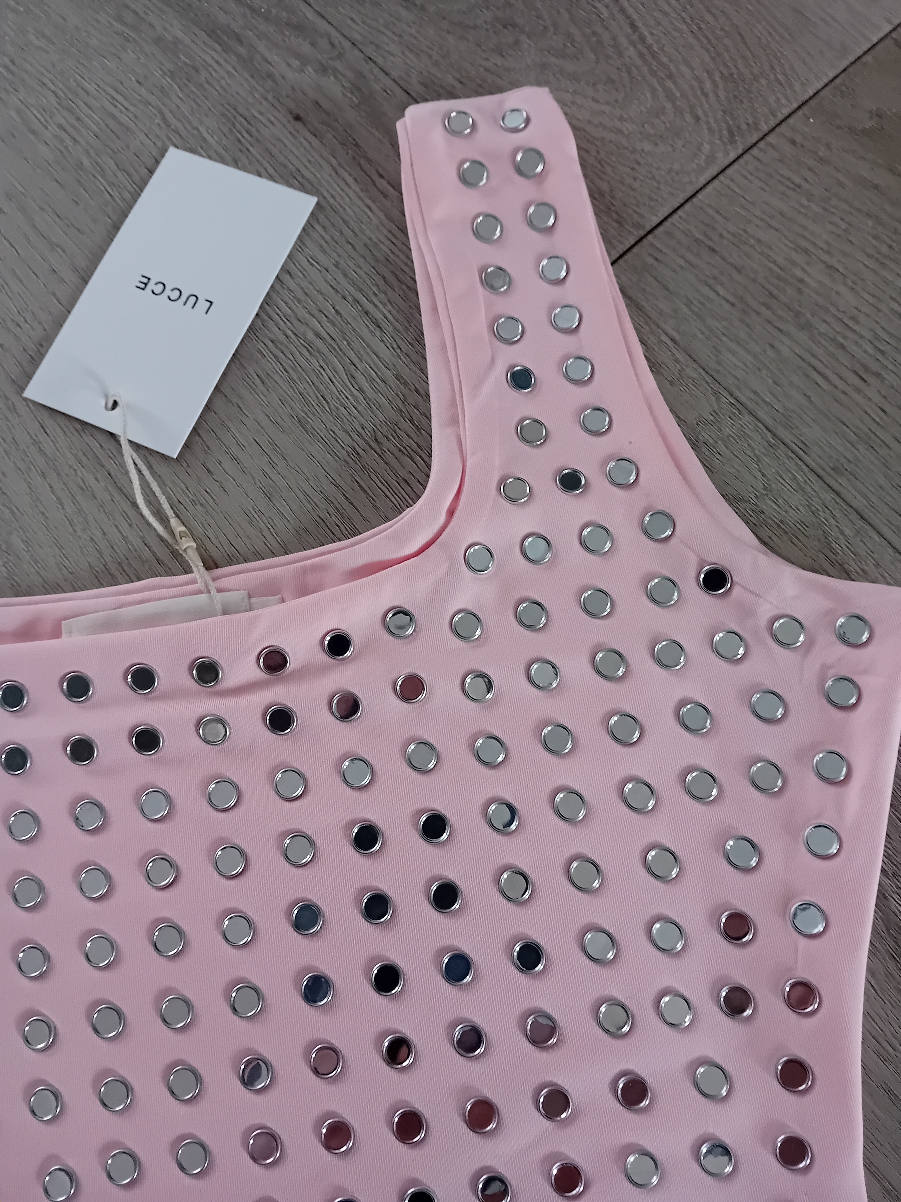 Gave croptop met mirror studds Fijne stretch travelstof van het merk lucce Deze top is verkrijgbaar in maat S-M-L.