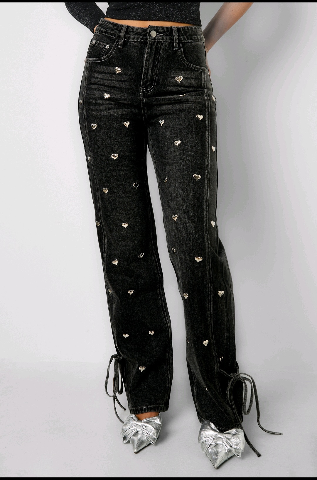 De Gimme Heartshine Jeans is dé eyecatcher voor jouw outfit. Deze zwarte jeans is afgewerkt met subtiele zilverkleurige hartjes die een speelse, maar stijlvolle touch geven. De rechte, iets wijdere pijp zorgt voor een moderne pasvorm, terwijl de striklintjes onderaan de pijpen een unieke en trendy twist toevoegen.