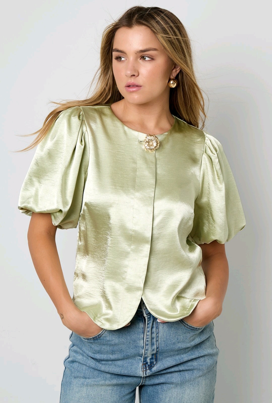 Deze glanstop met pofmouw hoort toch ook in jouw kast Draag hem op een jeans voor een sportieve maar toch classy outfit of combineer hem met een leuke short voor een feestje Details Merk gimme Matriaal 100% polyester Lengte 56/58 cm