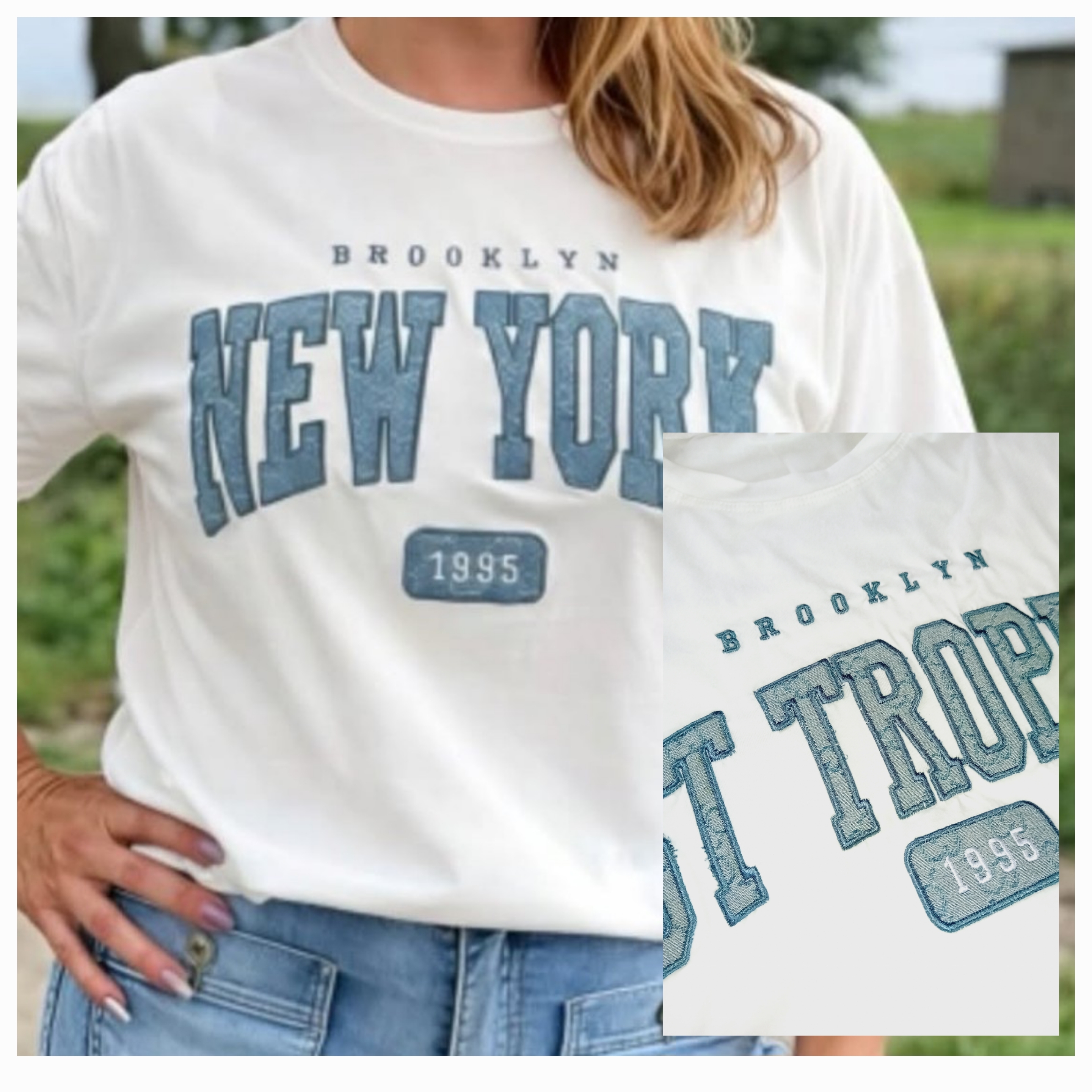 Musthave alert! ???? Dit trendy witte T-shirt met opvallende Brooklyn New York print in denim-look geeft jouw outfit direct een stoere en fashionable touch. Het shirt heeft een comfortabele loose fit en is perfect te combineren met een jeans, short of blazer voor een effortless everyday look. Een echte essential voor iedere kledingkast!