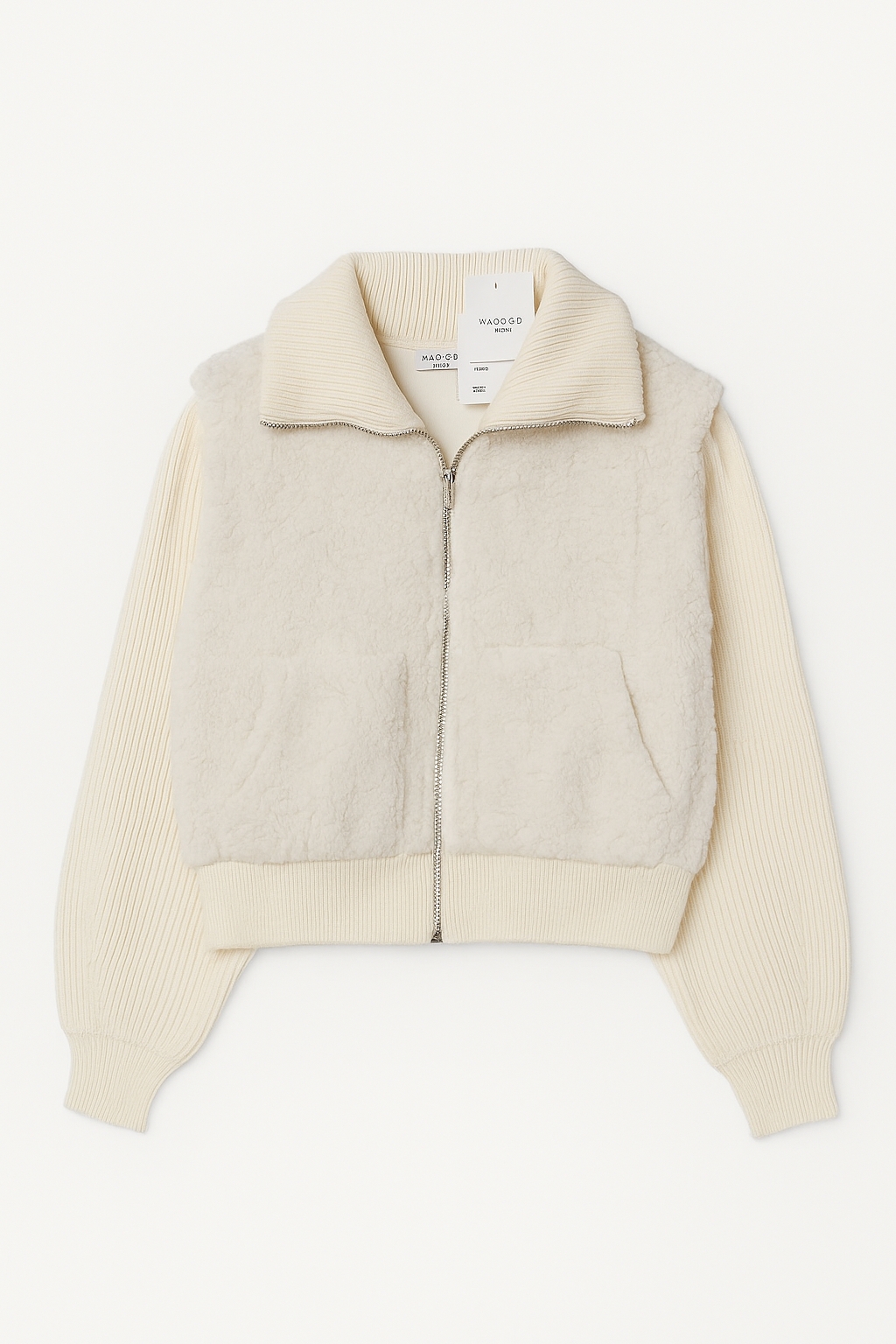 Trendy en heerlijk zacht vest met teddybont body en gebreide mouwen. Voorzien van een ritssluiting, kraag en twee steekzakken aan de voorkant. Combineert comfort met een stijlvolle, sportieve look.
