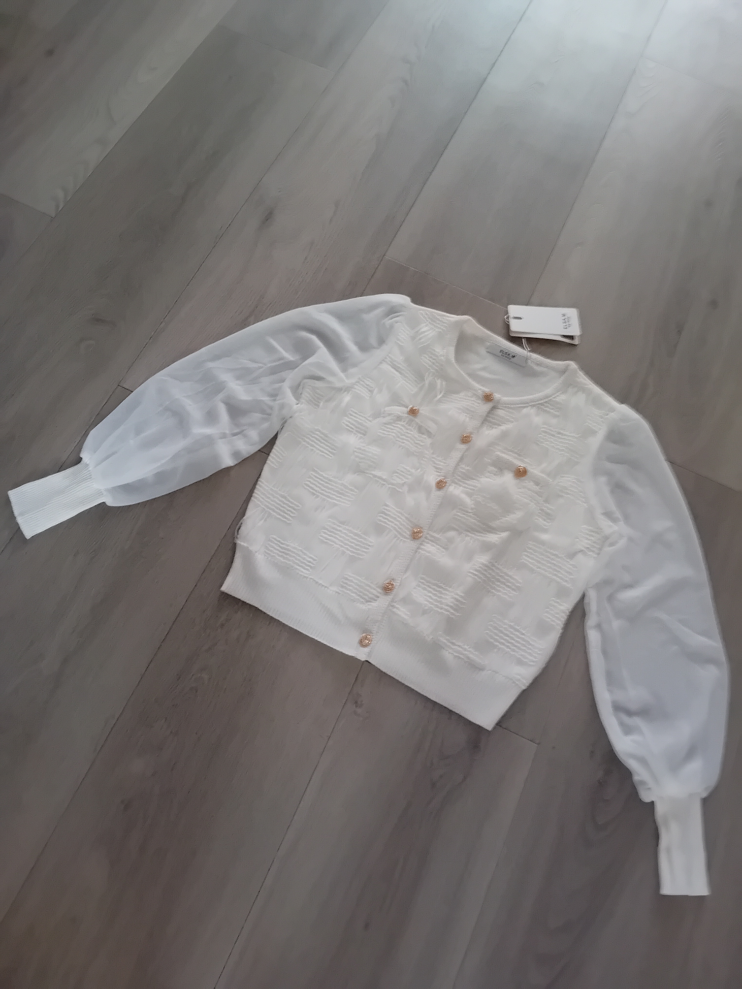 De combinatie van de fijne transparante mouwen en de mooie structuurstof geeft het vestje een chique en vrouwelijke uitstraling.